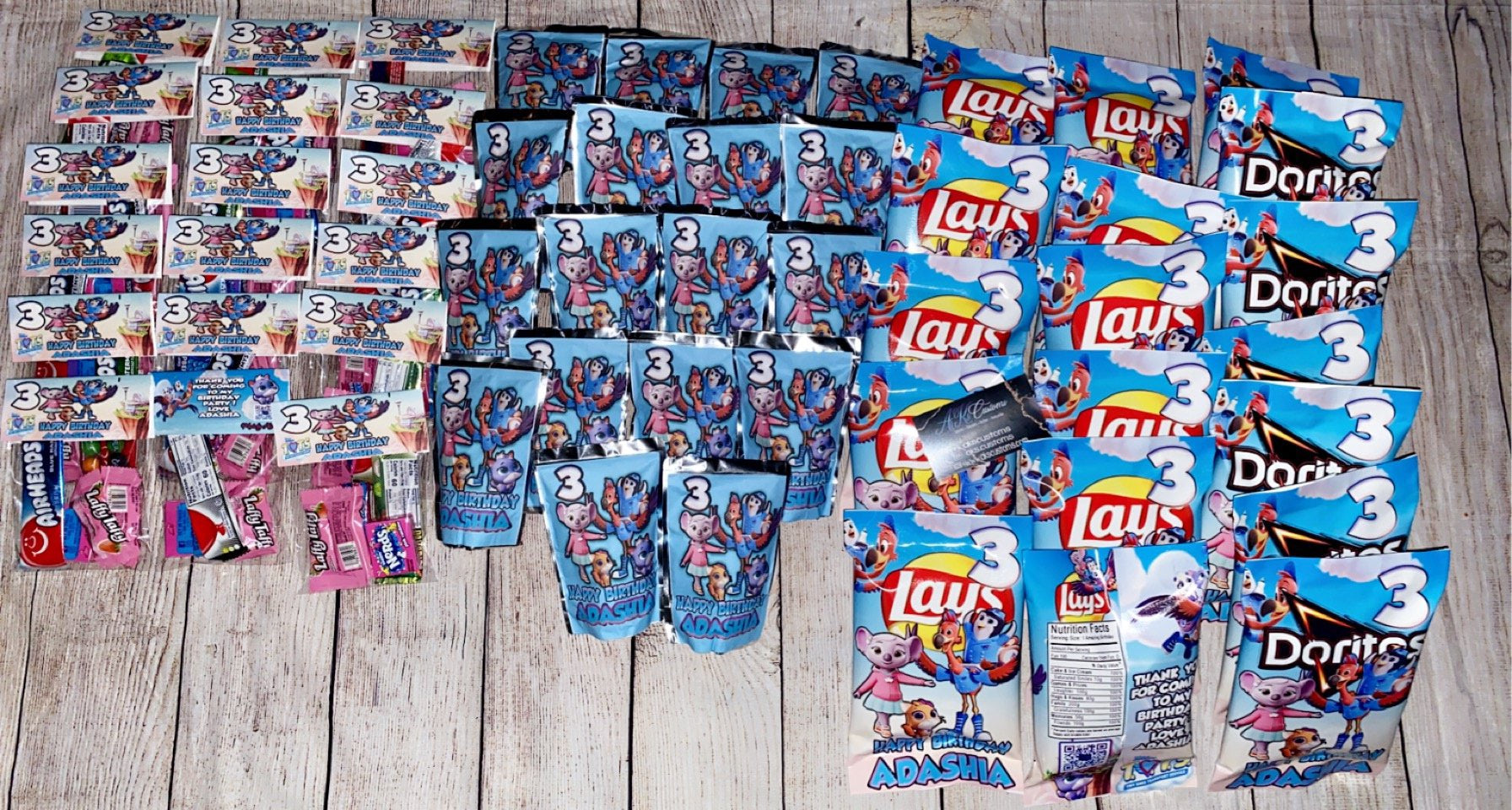 3 dozen Treats Deal ( can be juices, chips, candy, coloring books, cookie bags, cookie bins etc.) leave which favors in the notes. For example, an order could be a dozen of chips, a dozen candy, a dozen juices. OR 1 1/2 dozen chips 1 1/2 dozen candy.